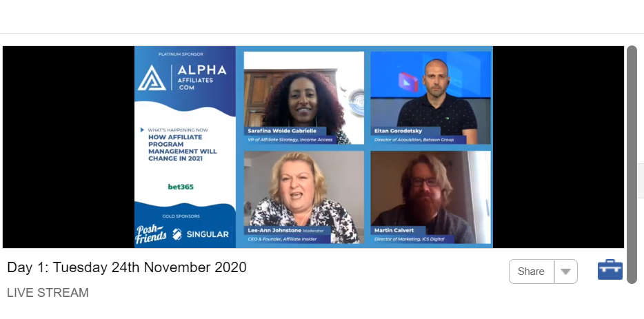 Moving on to the Marketing Confernce. Up next, Lee-Ann Johnstone moderates a panel on how affiliate program management will change in 2021.